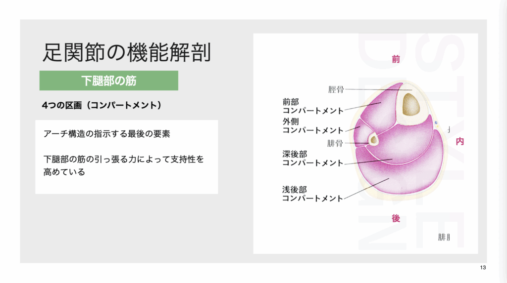 下腿の筋肉は大きく4つの区画に別れて、それぞれの張力で足の支持性を高めます