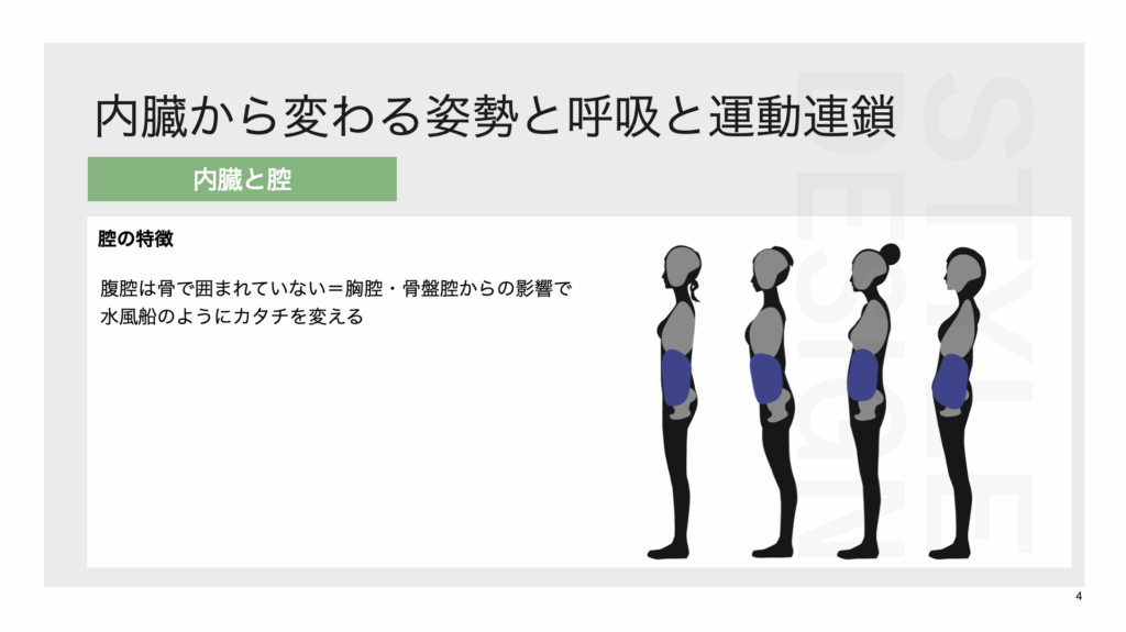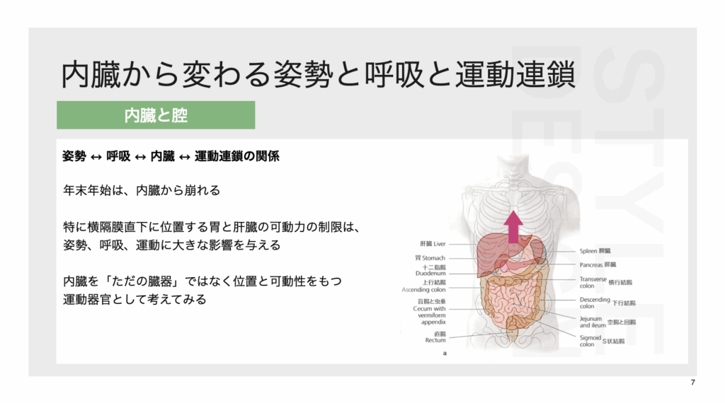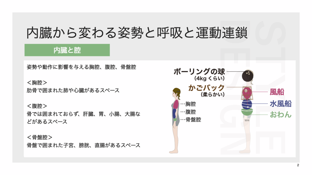 このことからスタイルデザインのレッスンでは、腹腔にアプローチする前に可動域制限が起きている胸郭エリアへのアプローチを優先することが多いですが、今回は逆説的に内臓へのアプローチから姿勢・体型に働きかけを考えました