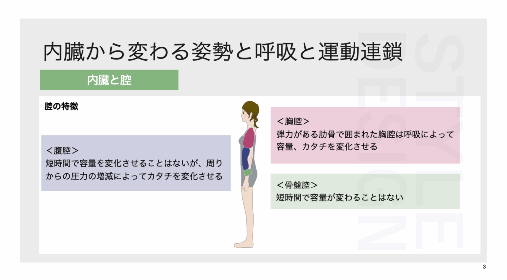 鼻腔、口腔、咽頭、胸腔、腹腔、骨盤腔とカラダの中で分けられる腔の中でも、姿勢や動作に影響を与える胸腔、腹腔、骨盤腔に焦点を絞って考えました